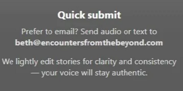 So you've had a experience and want to tell your story, but don't want your voice to be heard? That's more than understanding. You can write in to Encounters from the Beyond and I will tell you stories for you. At Encounters from the Beyond stories may be edited for grammar and narrative fluidity. Your story is not changed. You can find the contact us button and the first page and submit your story there.